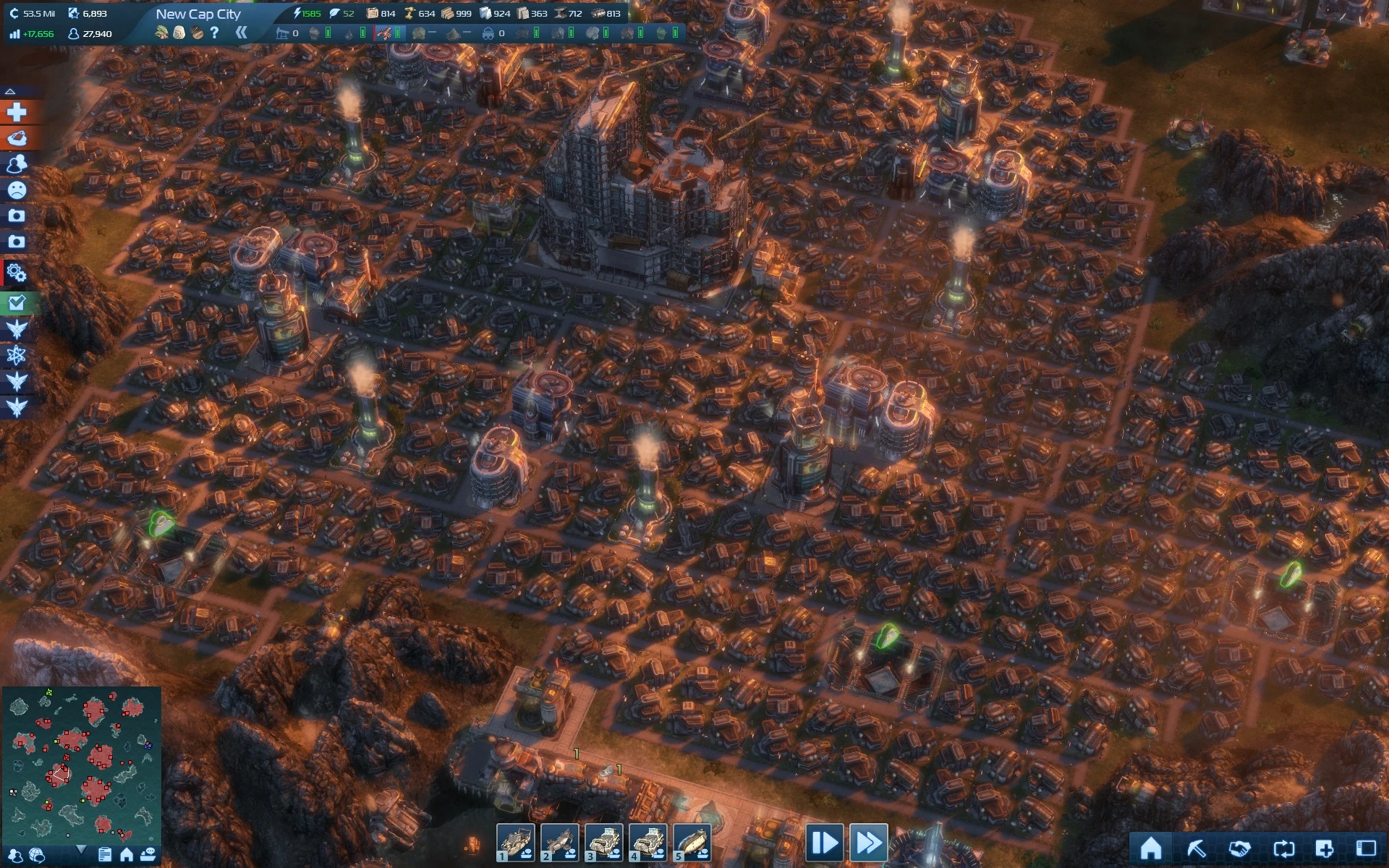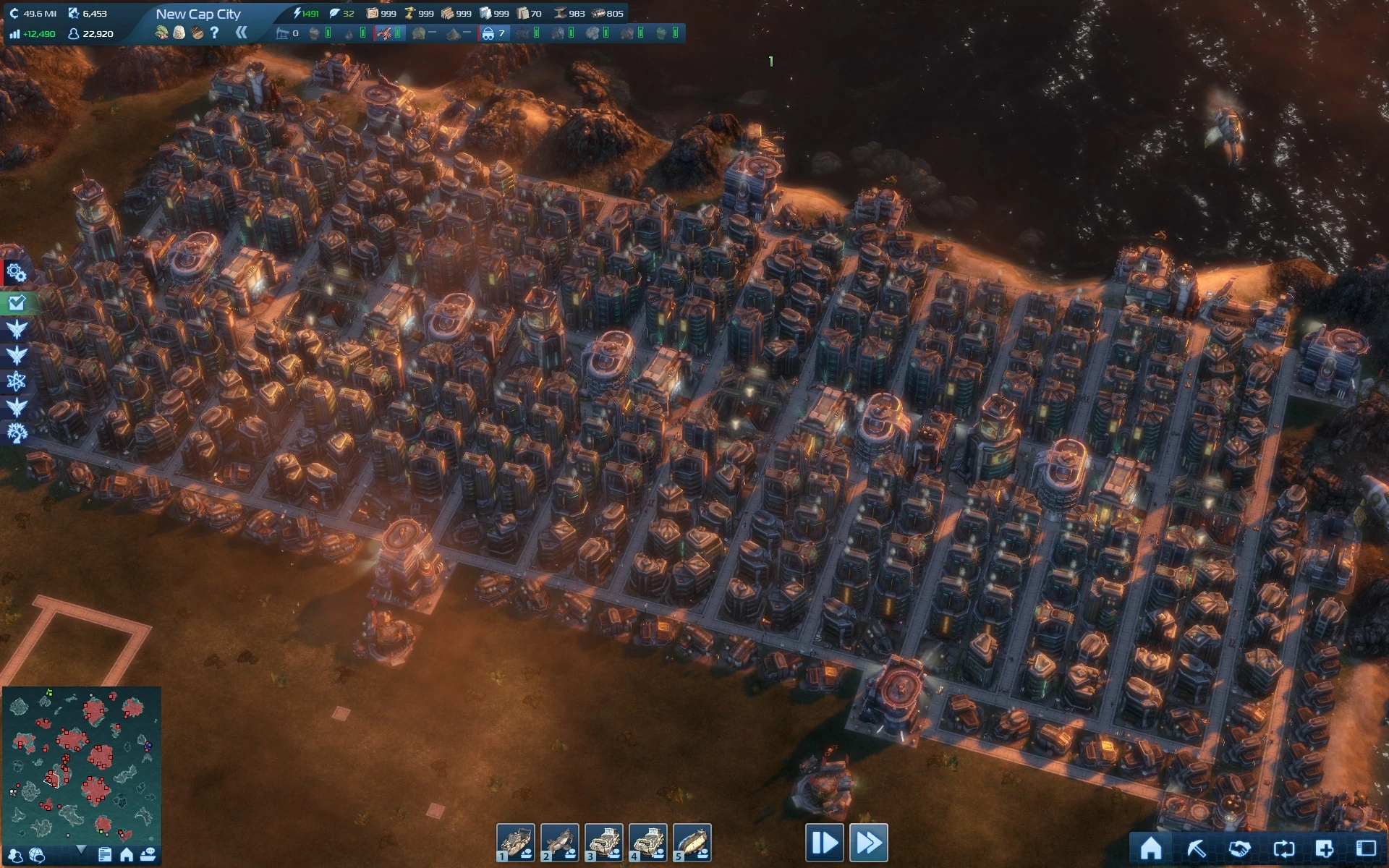 Now that your slums are gone, you are left with a mega-city of pure executives and engineers, in the example ont he right we have roughly 10,000 citizens generating 19,000 credits in tax, crammed into one little city core. Now you can go in and fix the island back up, plant trees or whatever you want. Also, you can now shut down your surplus production facilities, your new mega-city will only eat half what you were using before, but will generate double the tax income of a standard city.